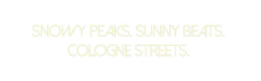 Text: SNOWY PEAKS. SUNNY BEATS. COLOGNE STREETS.